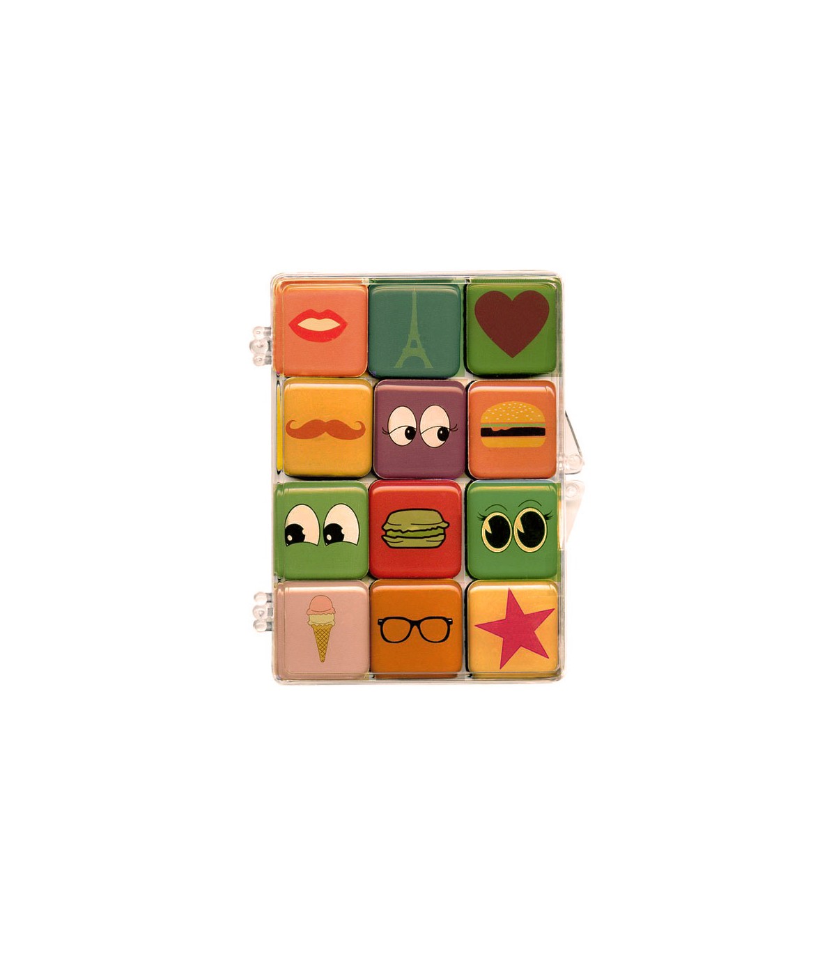 Set de 12 magnets décoratifs colorés et illustrés d'icônes rigolos pour fixer vos pense-bêtes et vos photos tout en gaité. Les couleurs sont vives et les motifs variés et et les motifs apportent une touche décorative relaxante et amusante.