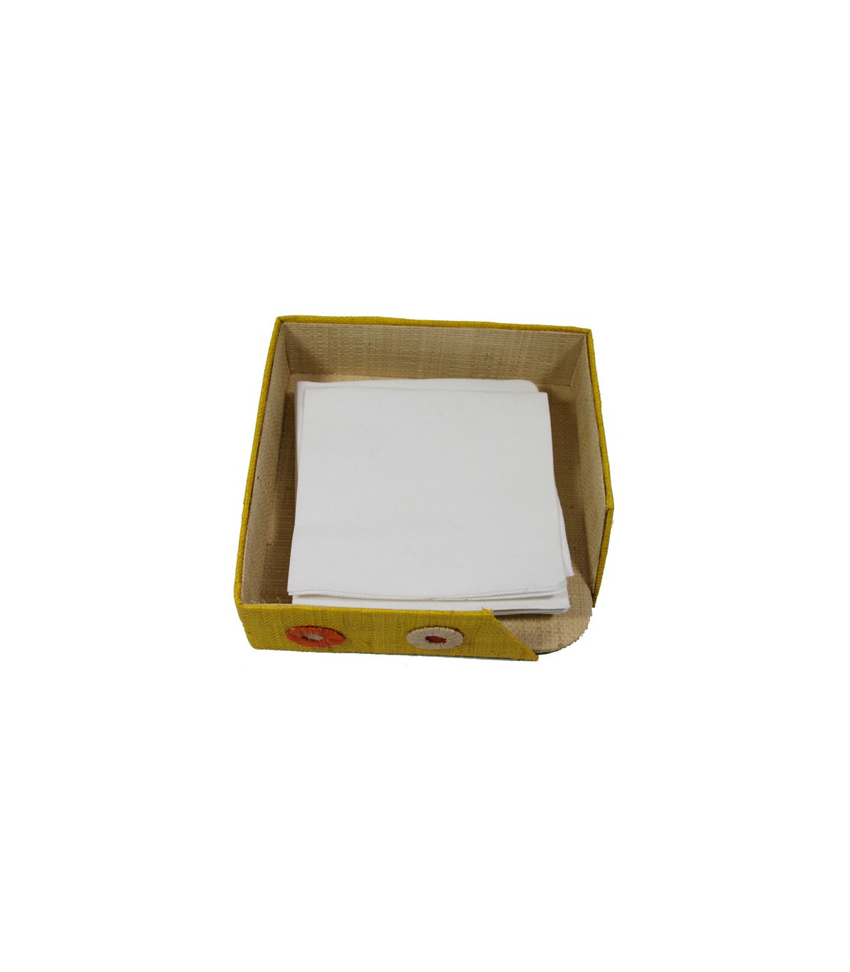 Boîte range-serviettes en papier en raphia décorée de pastilles colorées pour une décoration de table vitaminée. 16.5*16 cm, hauteur : 5 cm. Se décline en plusieurs coloris.