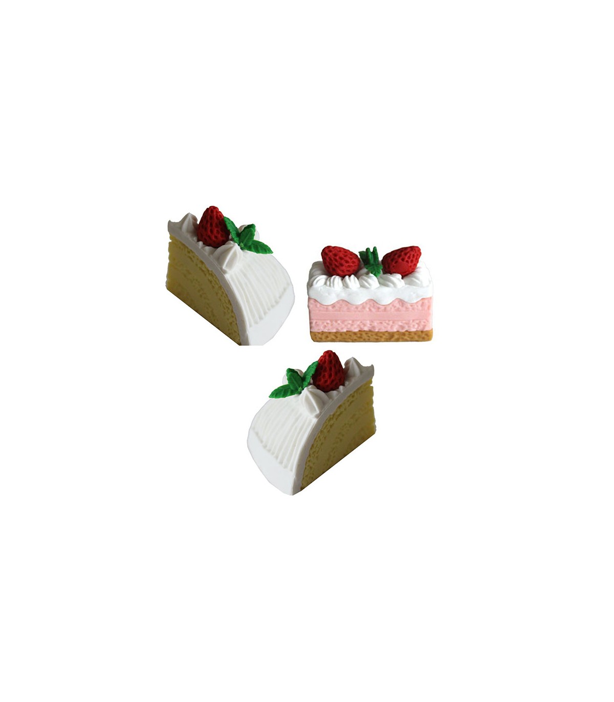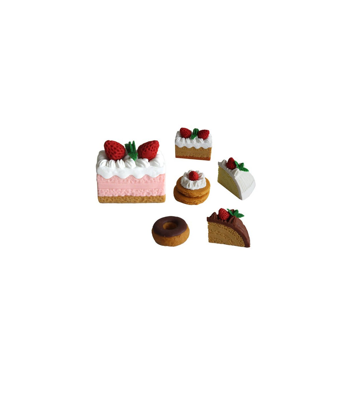 Ces gommes originales existent en différents assortiments de 2 ou 3 gommes : donuts, fraisiers, bûches glacées, baba au rhum ! Bref de quoi satisfaire la recherche d'originalité de chacun en fonction de ses goûts. Laissez-vous tenter, vous allez surprendre !!