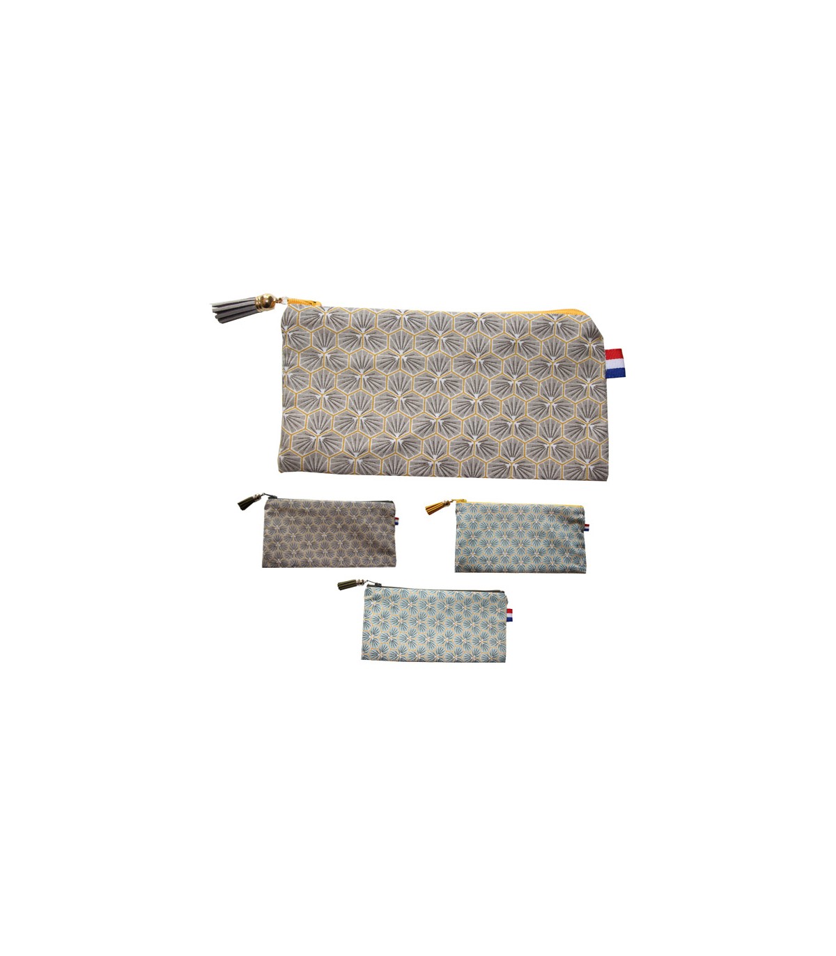 Le motif fleuri moderne de cette trousse est particulièrement tendance et il se décline en plusieurs modèles : beige avec zip jaune ou kaki ou bleu gris avec zip jaune ou kaki.